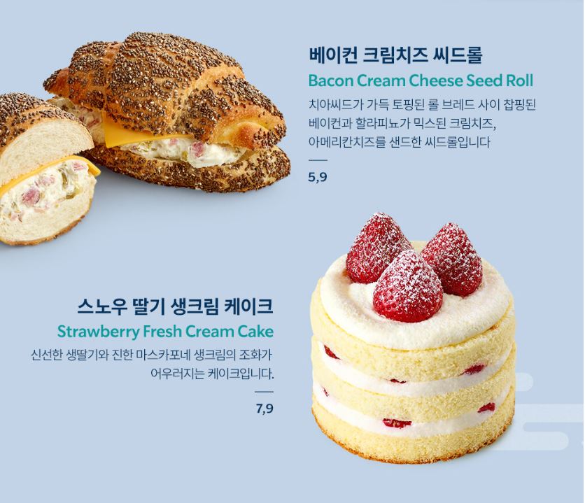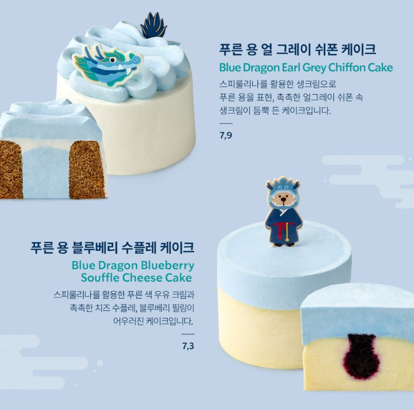 푸른 용 얼그레이 쉬폰 케이크, 푸른용 블루베리 수플레 케이크, 베이컨 크림치즈 씨드롤이 새로 나온 주인공으로 시피룰리나를 활용 하여 색을 냈다고 하네요~